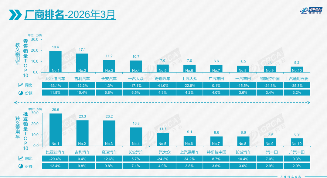 与之相呼应的是,3月头部自主车企依旧零售与批发市场榜单中占据着半数以上的席位。
