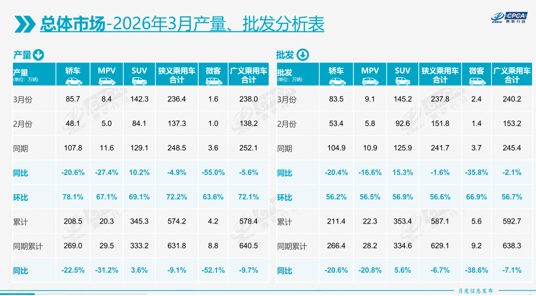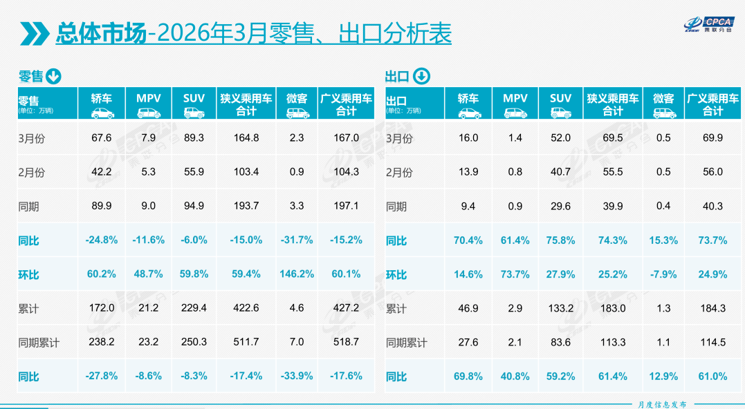 根据4月9日乘联会公布的数据,3月国产狭义乘用车零售销量同比下跌15%至164.8万辆。