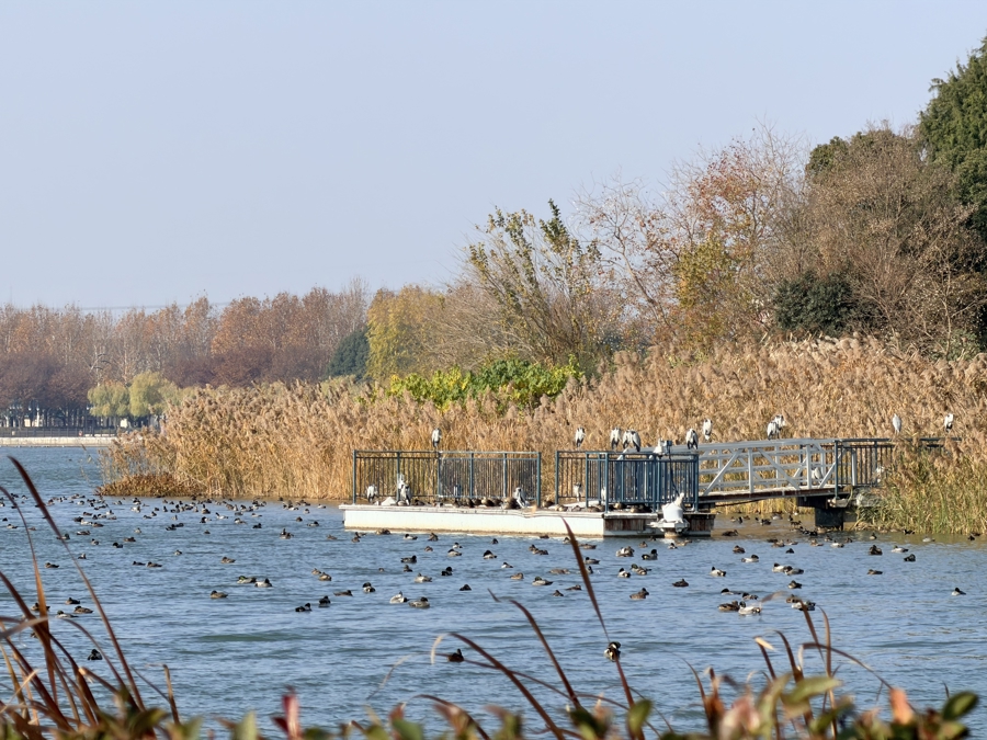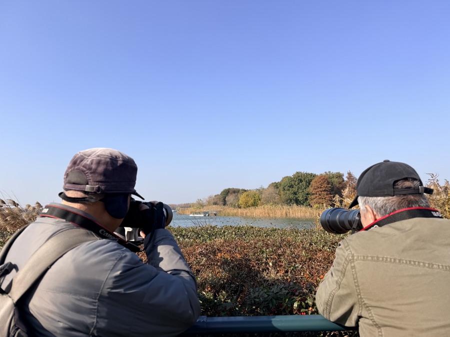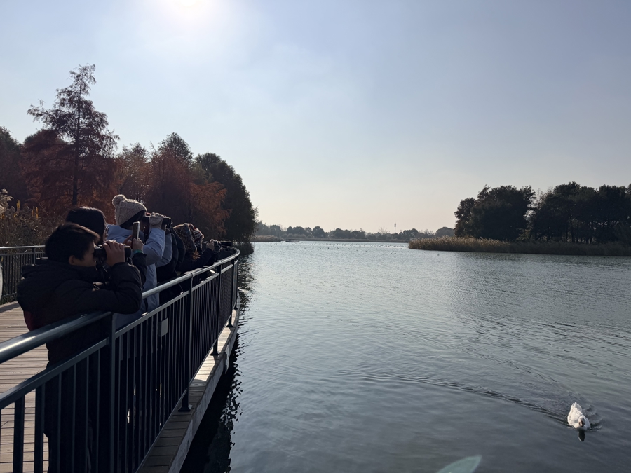 “每年12月开始到次年4月左右,都是观鸭的好时候,这里是距离市区最近的观鸭点。”领队朱老师介绍。虽然早晨气温较低,湖边还刮着一阵阵寒风,但天空一扫前几天的阴霾,湛蓝的星愿湖在阳光照射下,泛着粼粼波光。这是一个适合观鸟的好天气。
