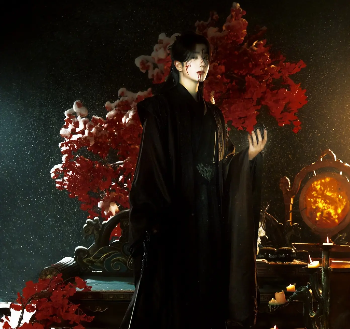 但是从之前的角色海报看,李宏毅演邪魅反派男主也很有辨识度,一身黑衣不怒自威,满脸血痕和背后的红花很有黄泉鬼王的气场。
